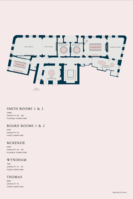 Located on the ground floor of Capella Sydney in the former offices of the Department of Education, a collection of bespoke meeting and event rooms highlight heritage embellishments and a contemporary interior design ethos. Catering for groups of 2 to 80 persons, each space features high ceilings, an abundance of natural light and the latest in high-tech conferencing equipment.