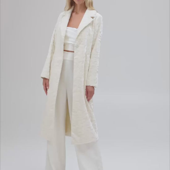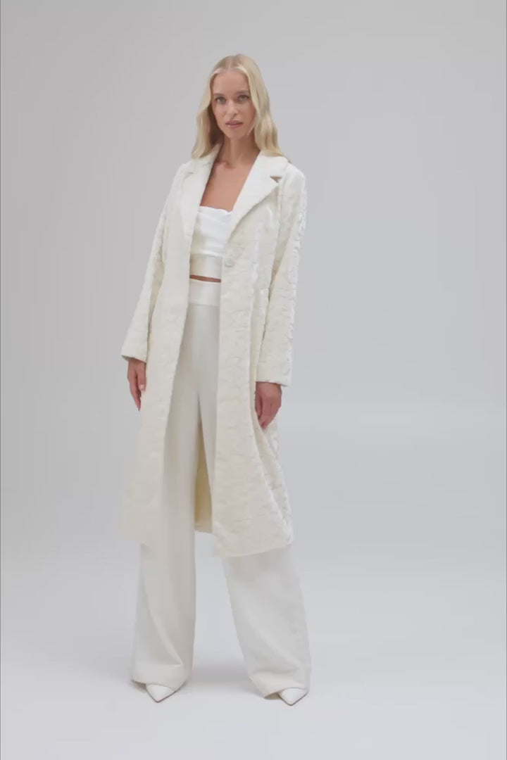 A velvet duster coat with a contemporary lace outfitting. The Romantique Coat is a luxurious layer for modern styling. This style reaches the below the knees and features satin lining and twin front pockets.