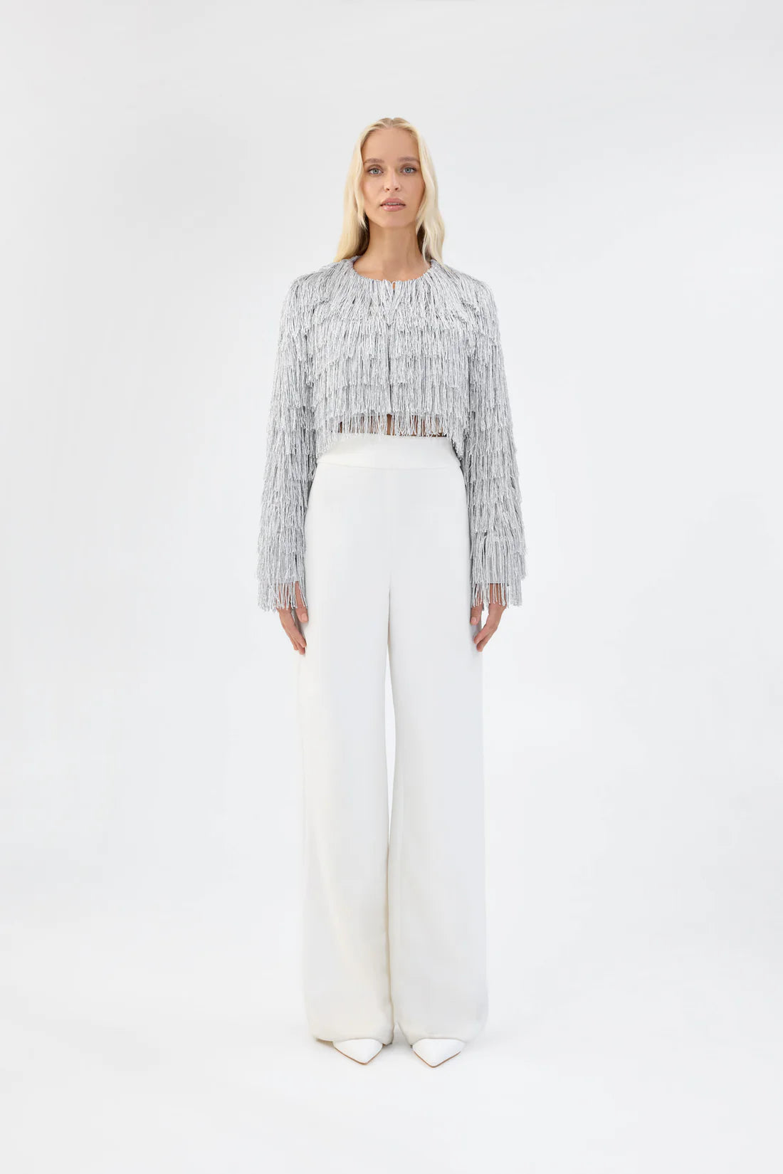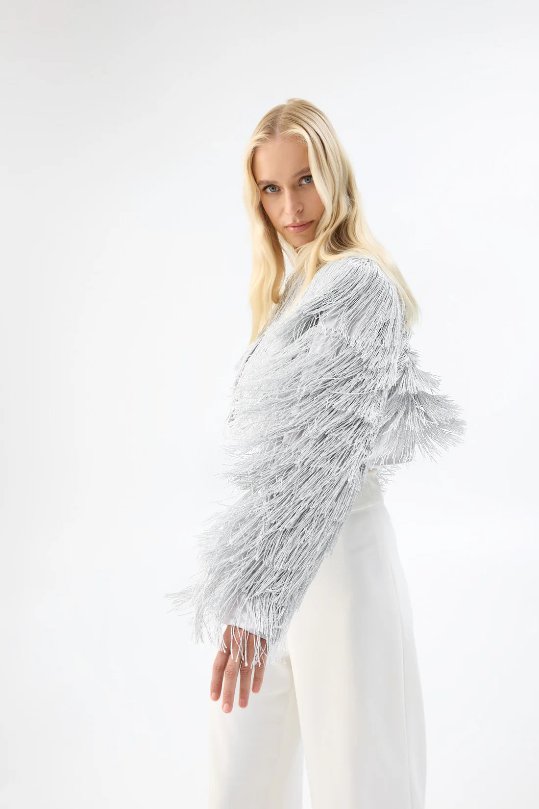 – Metallic lurex fringe detailing