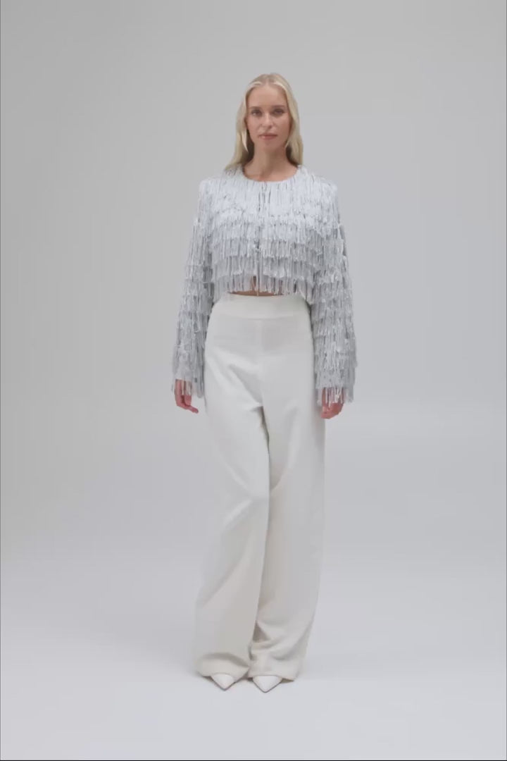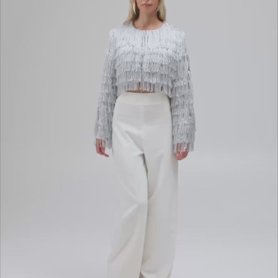The Copacabana Jacket embraces movement and shimmer with its metallic fringe detailing and satin lined interior. A cropped silhouette and round neckline enhance the playful yet elegant design. Five fabric covered hook and eye closures secure the piece, making it a cruelty free choice for celebratory occasions.